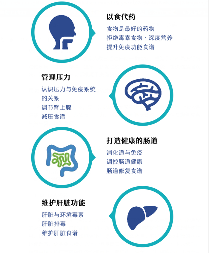 针对潜在的健康风险,功能医学提出了优化免疫能力的系统方案。即从饮食、压力、肠道和肝脏四大途径,全方位实现免疫系统的平衡,提升免疫力。