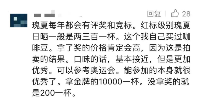 也有网友表示:瑰夏每年都会有评奖和竞标,而价格贵也是因为咖啡豆是拍卖的。