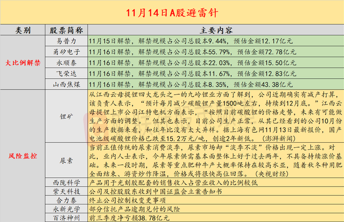 导读:财联社11月14日投资避雷针,近日,A股及海外市场潜在风险事件如下。国内经济信息方面包括:1)碳酸锂逼近15万元/吨关口,有云母提锂龙头酝酿减产至年底;2)业内人士表示,尿素价格或将高位回落;公司方面重点关注包括:1)4连板西陇科学公告,产品用于光刻胶配套的销售收入占营业收入的比例较低;2)紫天科技公司及控股股东收到中国证监会立案告知书;海外市场重点关注包括:1)美股三大指数收盘涨跌不一,大型科技股多数下跌;2)因担忧供应紧张,CBOT豆粕期货12月合约触及涨停。