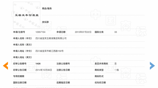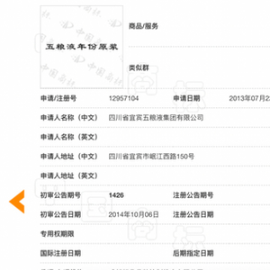 商标申请被驳回的原因,是申请商标完整包含了引证商标“年份原浆”全部文字(即古井贡酒获批商标)。可以说,自古井贡酒“年份原浆”获批之后,能冠以“XX年份原浆”字样的第33类(酒类)商标算是后无来者了。