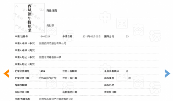 古井贡酒的“年份原浆”商标是在2016年12月28日被国家知识产权局核准通过的,这也是中国白酒业为数不多的直接把“年份原浆”字样明目张胆标注出来的商标,当然,由于后续的一些争议,它成为唯一的一款。