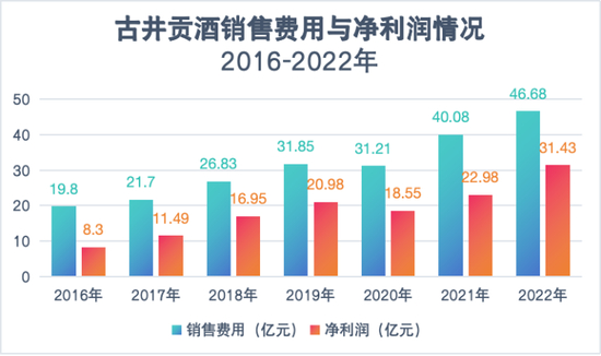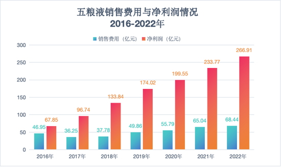 数据显示,2016年-2022年,五粮液的销售费用分别为46.95亿元、36.25亿元、37.78亿元、49.86亿元、55.79亿元、65.04亿元、68.44亿元,净利润则分别为67.85亿元、96.74亿元、133.84亿元、174.02亿元、199.55亿元、233.77亿元、266.91亿元,净利润长期保持着远远高于销售费用的水平。