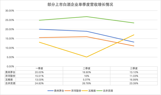 梁金辉的“再造一个古井”只差临门一脚,市场却对古井贡酒的高速增长起了担忧。从2023年单季度的数据来看,古井贡酒第一、二、三季度的营收同比增速分别为24.83%、26.78%、23.39%,远高于其他几家头部酒企的增速。