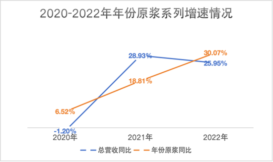 数据显示,2020年-2022年,古井贡酒年份原浆系列的营收分别为78.34亿元、93.08亿元、121.07亿元,同比增速分别为6.52%、18.81%、30.07%;同期,总营收分别为102.92亿元、132.70亿元、163.17亿元,同比增速分别为-1.20%、28.93%、25.95%。年份原浆系列占比总营收的比例分别为76.12%、70.14%、72.44%。