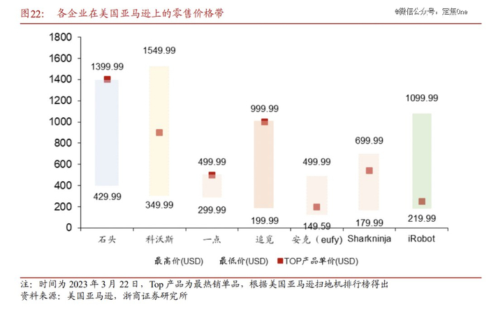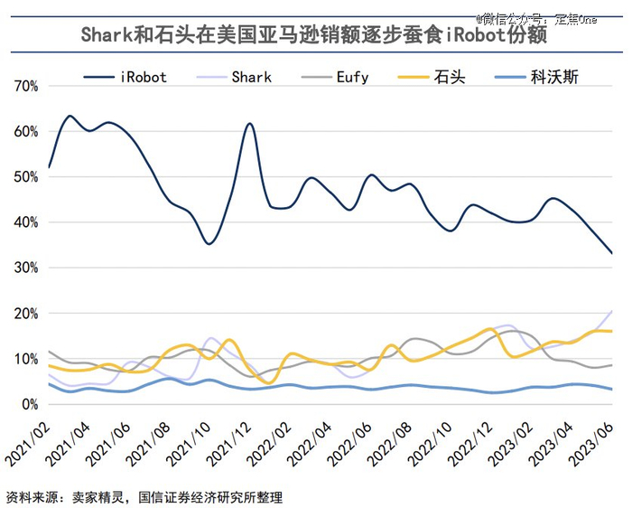 2020年之前,科沃斯好不容易挤进北美市场前三,市场份额只有3%。2021年以来,石头科技开始在线上渠道崭露头角,根据国信证券2023月6月的数据,石头科技以15%以上的份额进入美国亚马逊扫地机第三名;科沃斯在美国亚马逊的份额变化不大,还在5%以下。