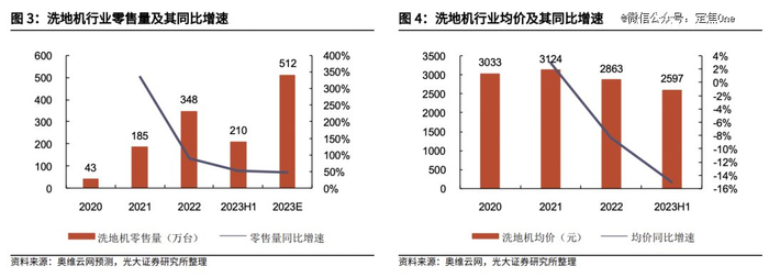 洗地机的价格也降得更明显。相比扫地机过往靠价格上涨驱动增长,洗地机的价格曲线是向下的,也有利于加速消费者教育。洗地机2021年的行业均价是3124元,到2023年上半年降到了2597元。