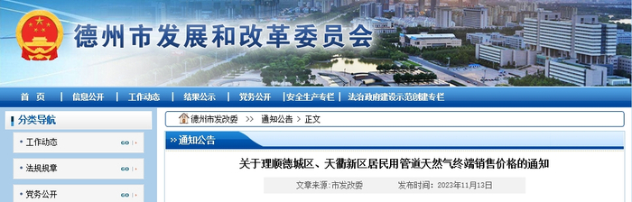 根据山东省发展和改革委员会《关于落实居民用气价格联动政策的通知》(鲁发改价格〔2023〕286号)和《德州市管道天然气价格上下游联动办法》(德发改价格〔2020〕502号)、《关于继续执行德发改价格〔2020〕502号文件的通知》(德发改价格〔2022〕594号)等文件精神,经市政府同意,决定理顺德城区、天衢新区居民用管道天然气终端销售价格,现将有关事项通知如下:
