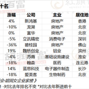 龙湖59岁的吴亚军财富缩水70亿至665亿,蝉联中国白手起家女首富。去年女首富杨惠妍财富缩水270亿,以480亿位列第五。立讯精密56岁王来春(财富530亿)、蓝思科技53岁周群飞(财富420亿)位列前十,两位的最大客户都是苹果。