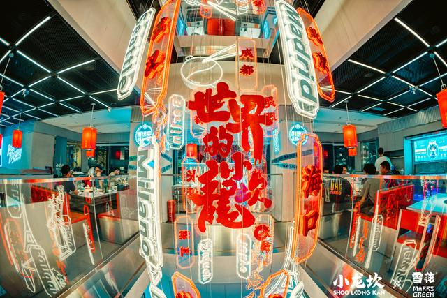 在装修上,小龙坎火锅科华潮玩店整体呈现赛博朋克未来感:门头首次运用门型大屏不间断高频播放品牌创意物料,生动传达双方品牌理念,高光引发路人驻足侧目拍照,进行二次传播;龙小茶焕然一新,变身“公路商店”,对外开放式档口满足年轻人交友喝酒的轻松氛围,太空造型“小龙侠”玩偶作伴,材质充满科技未来感。