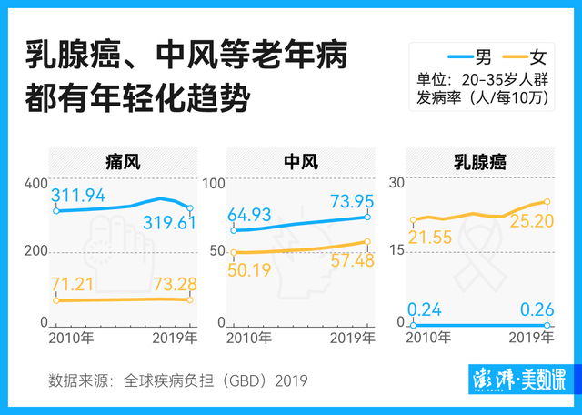 在全球疾病负担(GBD)数据库的 369 种疾病中,我们选取了多种常发于老年人的疾病进行观察。数据显示,在中国 20 至 35 岁人群中,中风患者、痛风患者、女性乳腺癌患者在每 10 万人中分别增加了 14.44 名、9.71 名、3.65 名,其中中风患者数量在不同性别都有明显增多的迹象。