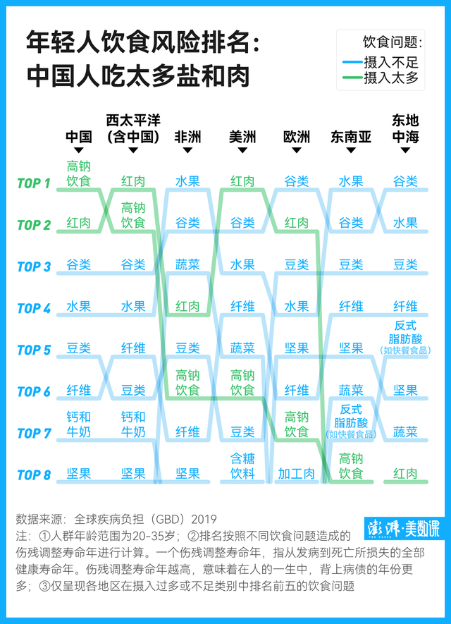 对比中国和其他地区的饮食结构数据,我们发现导致中国 20-35 岁人群背上病债的饮食风险更多来自,高钠(盐)饮食和红肉摄入过多,而欧洲、美洲等地区的谷类和水果摄入不足情况对健康的影响更大。过多的钠(盐)摄入与高血压、心血管疾病等健康问题都有关系,而猪肉、牛肉等红肉的摄入过多,容易引发高血糖、糖尿病、高 BMI 等健康问题。