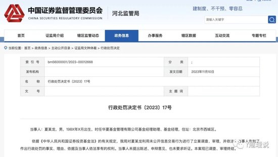 河北证监局于11月10日宣布了针对夏云龙的行政处罚决定。他因涉嫌两项违法行为受到了重罚:被责令改正,不仅被没收了530.78万元的违法所得,还被处以相等数额的罚款,总计高达1061.56万元。