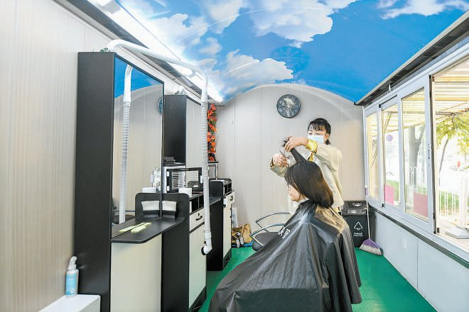 马官营公交便民驿栈为市民提供快剪理发服务。