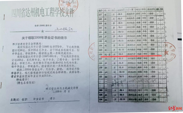 同时,学校还给她复印了一份《四川省达州机电工程学校文件》(校学2000第01号),在这份《关于领取2000年毕业证书的请示》显示,编号为126号的赵荔,籍贯四川巴中,机制专业3年,招生类别为“委培”。