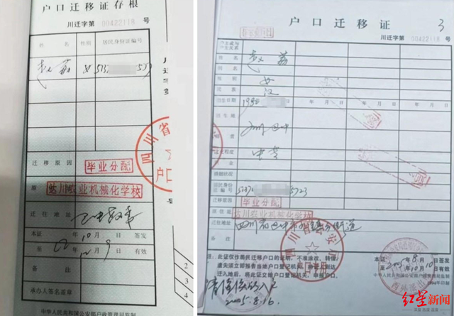 她提供的户籍资料显示,其中共出现了3个不同的身份证号码。其中,其户籍迁入达州的学校后,户籍资料中的身份证号为尾数“512”的15位身份证号。不仅如此,从达州迁出户口回巴中的户籍存根资料显示,又变更其15位身份证号码尾数为“577”,迁移原因是“毕业分配”,迁往地址为“巴中教委”;而另一份户口迁移证则显示,其尾数为“5723”的18位身份证号码迁入巴中九镇乡街道。