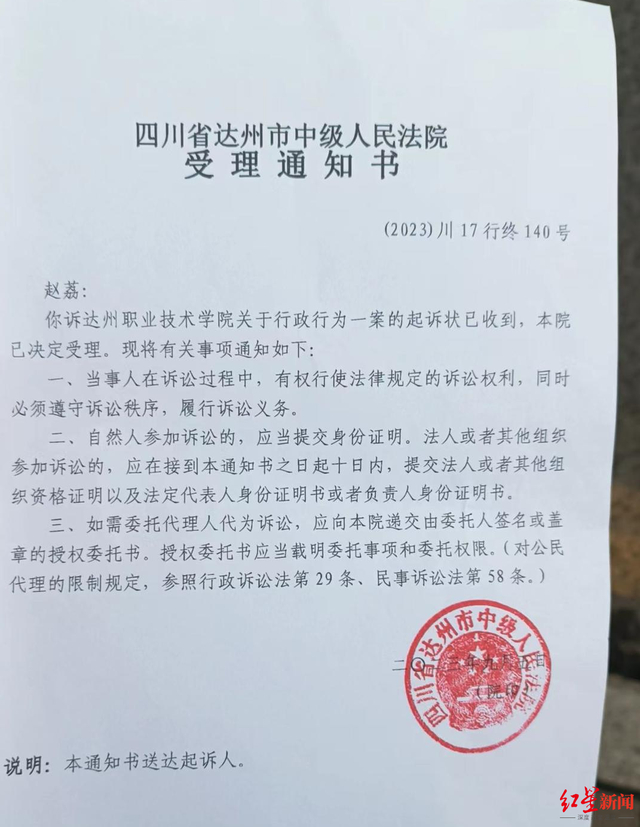 针对一审法院判决,赵荔表示不服,称达州职业技术学院应向自己提供诉讼请求的相关资料,自己的档案可以不提供,但档案去了那里,学校有提供相关信息的义务。2023年8月28日,赵荔向达州市中级人民法院提起上诉。近日,赵荔收到该院受理通知书。