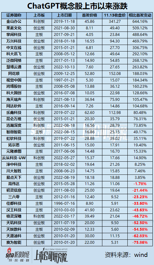 相比首发价格上涨幅度较大的公司包括金山办公、果麦文化、掌阅科技、万兴科技、中文在线、科大讯飞、泛微网络、慧博云通等,上述公司的11.13日收盘价相比首发变动超过了200%。其中涨幅最大的是金山办公,涨幅644.16%,其次为果麦文化509.12%。由此来看,不论是自研大模型,还是接入大模型应用,ChatGPT概念的确使部分公司实打实获益。