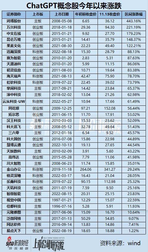 从今年以来股价涨跌来看,“ChatGPT概念股”称得上是收获颇丰。35家上市公司在今年以来截至11.13日收盘,无一例外全部实现了股价上涨,但涨幅表现各异。