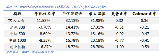 从各项风险收益指标来看,中证人工智能主题指数具有较高的投资价值。具体而言,无论是年化收益率所代表的获取收益的能力,还是夏普比率和Calmar比率为代表的考虑了风险之后的收益能力,中证人工智能主题指数都明显优于其他基准指数。因此中证人工智能主题指数历史表现优秀,具备较高的投资价值。