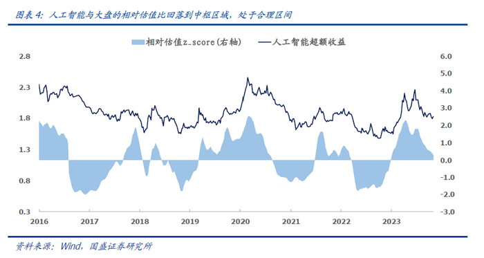 1. 人工智能趋势指标位于0轴上方,处于右侧区域。在报告《行业轮动的三个标尺》中我们以行业相比于大盘指数的信息比率去衡量其趋势,即行业过去一年超额收益比较稳定的时候,就代表着其趋势较强。从下图可见,当前人工智能行业的趋势打分为0.1,位于0轴以上,处于右侧区域,中期趋势向上。