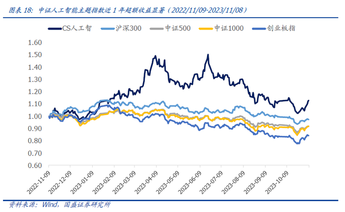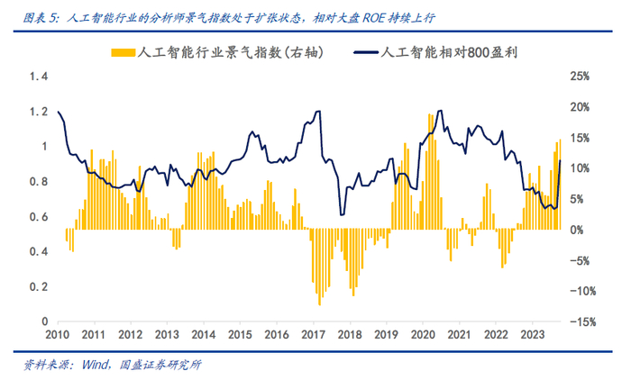 在之前发布的报告《分析师行业景气指数构建与应用》中,我们基于分析师的个股盈利预测数据,采用扩散指数的编制方法构建了分析师行业景气指数,指数在0轴以上的时候定义为扩张期,反之为收缩期。如下图所示,我们计算的人工智能景气指数从2022年8月底开始进入扩张区间,当前为15%,相对大盘ROE有望持续改善。