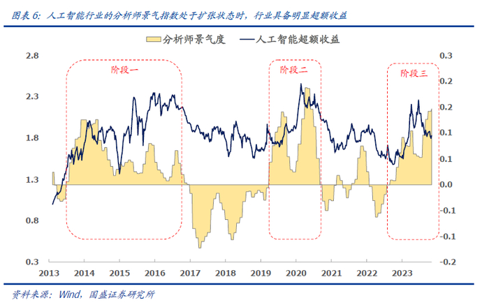从历史超额收益(相对中证800)来看,2013年以来,人工智能行业有三段跑出明显超额收益的行情,历史持续时间基本在两年左右,这三个阶段对应的分析师景气指数均处于扩张状态。而此轮超额收益行情自2022年11月开始,目前刚好一年,近期分析师景气度有所回升,未来一段时间人工智能行业超额收益可期。