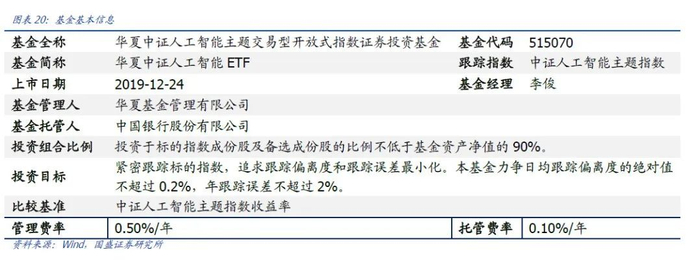 华夏中证人工智能ETF(代码:515070)。基金成立于2019年12月9日,于2019年12月24日上市交易。基金投资目标是紧密跟踪标的指数,追求跟踪偏离度和跟踪误差最小化。本基金力争日均跟踪偏离度的绝对值不超过0.2%,年跟踪误差不超过2%。