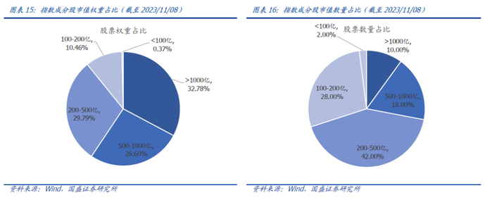 从成分股市值分布来看,中证人工智能主题指数成分股偏向大市值风格。截至2023年11月8日,指数的50只成分股总市值约2.32万亿元。从具体成分股来看,市值1000亿以上的成分股共有5只,累计权重占比高达32.78%,总市值在100亿以下的成分股仅有1只,其权重占比为0.37%。因此,整体而言,中证人工智能主题指数在市值风格上偏向大市值。