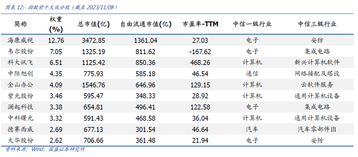 从前十大成分股来看,中证人工智能主题指数成分股集中度较高,主要配置人工智能产业链龙头股。指数成分股数量为50只,截至2023年11月8日,指数前十大成分股累计权重为50.21%,集中度较高,其聚焦人工智能产业链龙头股。例如,指数前三大成分股分别为国内安防龙头股海康威视、半导体行业龙头股韦尔股份,以及人工智能行业龙头股科大讯飞,其在指数中的权重占比分别为12.76%、7.05%、6.51%。