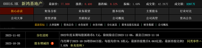 截至2023年11月14日,新鸿基地产市值超2200亿港元,新鸿基地产2022年度末每股派3.7港元。