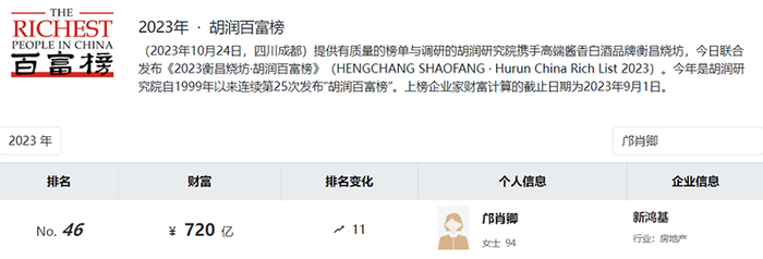11月14日,胡润研究院发布《2023红颜会·胡润女企业家榜》显示,新鸿基地产邝肖卿以720亿元财富,首次成为中国女首富。