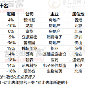 较为知名的龙湖集团吴亚军、富华国际陈丽华、立讯精密王来春,均排名榜单前十位。