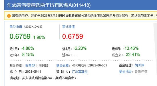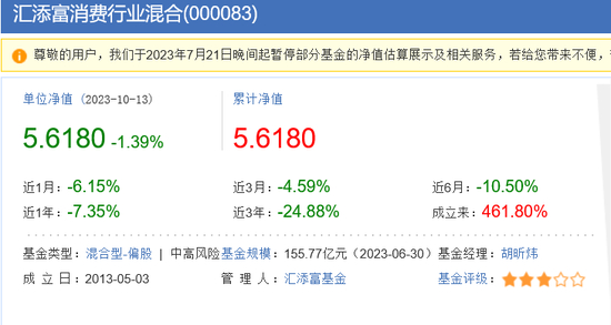 10月13日,汇添富消费行业混合(000083)最新单位净值5.618元,下跌1.39%,近两年收益-30.19%,同类排名下跌152位,至1355名。