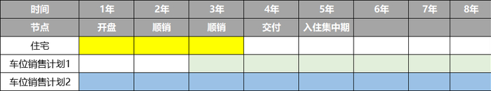 如上图所示,住宅销售周期2-3年,“车位销售计划1”的开售时间晚于“销售计划2”,显然错过了项目的热销期。