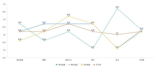 在本次满意度调查中(1—10分制),消费者对三家快递公司的总体评分都比较好,满意度都比较高。菜鸟速递、顺丰速运和京东物流三家快递物流的满意度评分整体上较为接近,其中菜鸟速递与顺丰速运分值均为8.33分,京东物流为8.32分,稍有落后。菜鸟速递在“服务”与“售后”上更有保障,顺丰速运在“送件速度”与“安全”上更受消费者认可,京东快递在“送货上门”较受消费者喜欢。