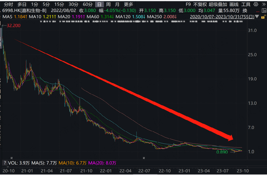 但好景不长,嘉和生物上市后的股价一路猛跌,从最高点32.2元/股跌至最低点0.89元/股。截至11月6日,股价为1.3元/股。