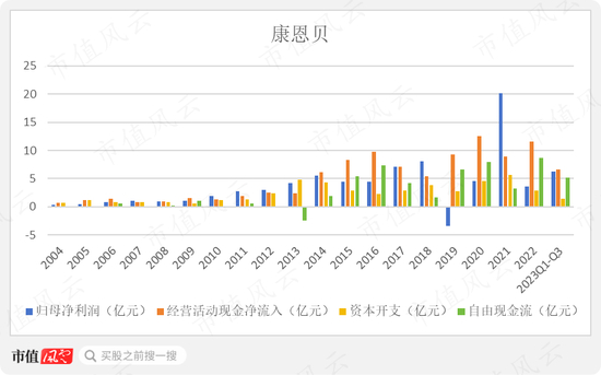 每年收现比保持在1左右,营收基本都能以现金形式收回。这些年的资本开支又比较少,因此自由现金流总能实现正向流入,上市20年里合计达52.11亿元。