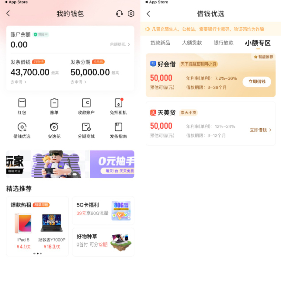 一年后,我们却看到越来越多关于循环经济公司转转金融变现的消息。因金融的特殊性和敏感性,缺乏金融牌照的转转主要走助贷路线,部分业务游走在合规边缘:除了为多个金融机构的贷款产品导流外,其贷款超市涉嫌为无牌平台导流,自营的租机业务“趣租机”也多次陷入“高利贷”争议。