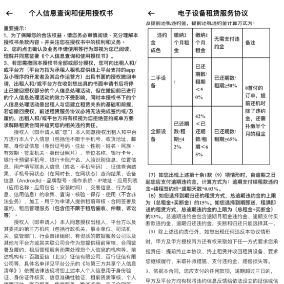 除了利息较高,选择租机之后,用户还要一键同意趣租机的大量隐私条款,并承担违约责任。此外,还要授权转转查询用户征信、委托扣款、以及非在校学生承诺书。转转还会在用户预期后进行催收。