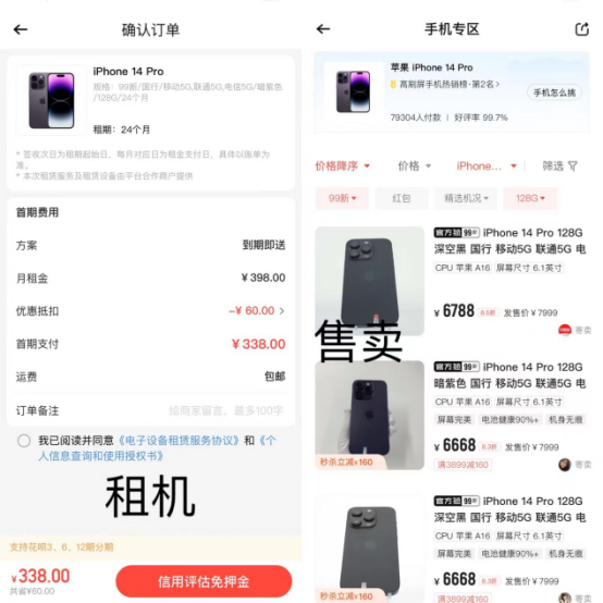 笔者尝试在趣租机上租一款99成新的“iPhone 14 pro 国行 暗紫色 128G”,分24个月支付,到期寄送。页面显示月租金398元,首期优惠60元需支付338元,即最终拿到这部手机需要支付9492元。