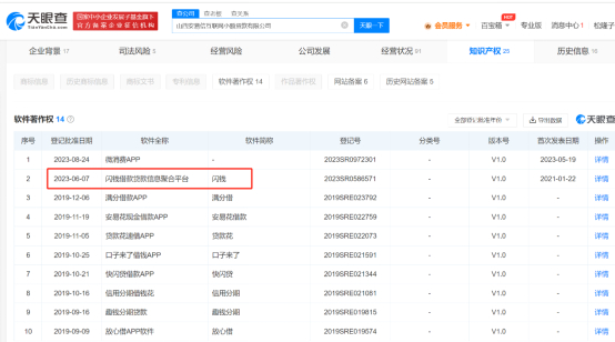 在该公司的软件著作权中,包含闪钱、满分借、贷款花等14个贷款类APP。而闪钱的定位是贷款信息聚合平台,即贷款超市。