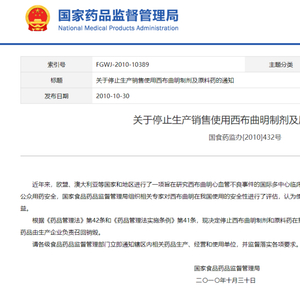 2010年10月,国家食品药品监督管理局发布通知,停止西布曲明制剂和原料药在中国生产、销售和使用。