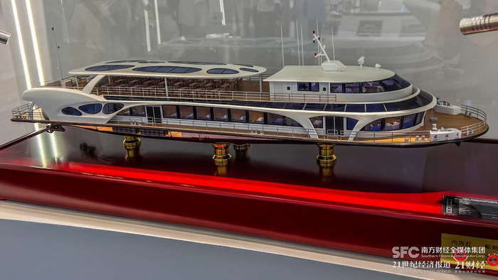 其中,电动船舶被纳入储能五大应用领域之一。而在亿纬锂能的产品展厅内,国内第一艘50米以上纯电动客船“君旅号”的模型也在一众电池产品间显得尤为“出挑”。这艘2020年在武汉起航的纯电动客船搭载了亿纬锂能的纯电池动力系统,电池容量为2270kmh,电池续航力达8小时(7节航速)。
