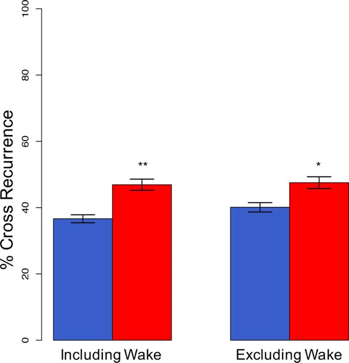 与单独睡眠(蓝条)相比,共同睡眠(红条)中睡眠阶段的完全、直接同步性显著增加,甚至近一半的夜间睡眠都是同步的,图片来源:参考文献 [1]