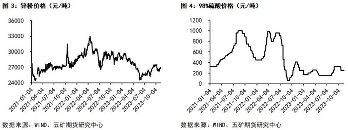 2023年间,硫酸价格基本维持再150-330元/吨的区间。根据锌冶炼厂成本测算模型,每生产一吨锌,需要消耗硫酸300千克左右。
