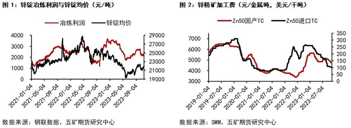 对于锌冶炼厂而言,这部分可变成本相较于去年有着较大的下行。此外,由于我国炼厂和锌矿山在进行利润分配时,往往会采用"二八"分享的价格分享机制,冶炼厂享有精锌价格超出基准价部分的20%的分成这就导致锌价相对高位时,价格分享机制带来的收益补偿了加工费下行造成的利润缺口。叠加成本端的下行,尽管2023年中锌锭炼厂的利润在年内有所下滑,但仍然处于一个相对高的位置。