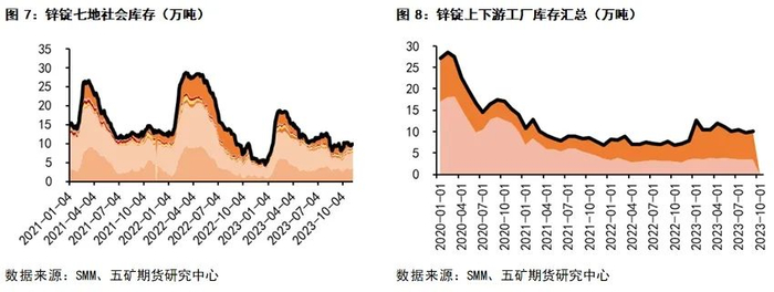 另外,从库存的角度看,2022年全年国内锌锭社会库存均处于一个去库的过程中,年初时锌锭社会库存更是达到了4.4万吨的历史低位。锌锭现货市场偏紧的状况也进一步刺激了炼厂在2023年中增产锌锭。从右下图锌锭的上下游工厂总库存也可以看出23年锌锭的较大增产。