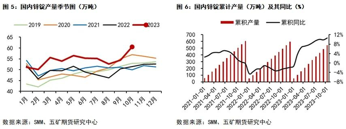 2023年1月后国内锌锭产量高于往年平均水平,根据SMM数据,10月份国内锌锭产量60.46万吨,同比增长17.6%,环比增长11.44%。再看2023年前10个月份锌锭累计产量已达545万吨,累计同比增长10.65%。从利润和库存两个角度都可以看到炼厂增产的逻辑。