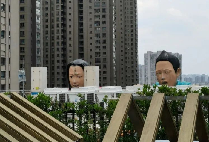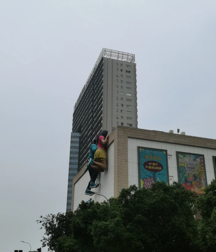 项目外立面扒着一男一女两个15米长的超大人形IP。不管是从整体过于“生动”的造型,以及攀爬墙面立意,都显得不合时宜且“瘆得慌”。特别是到了晚上,有网友吐槽,“但凡心脏不好的,都得吓出病”、“娃娃看到这个’正脸’,分分钟吓哭”。也有不少网友反应,这样的设计,对于还在认知建立阶段的孩子,会产生一定的模仿效应,十分不可取。