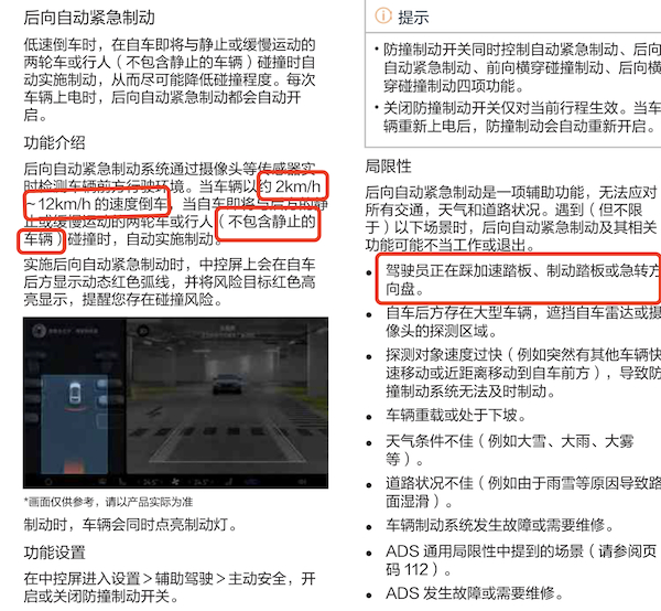 除此之外,该功能还罗列了9条局限性的情况,包括驾驶员正在踩加速踏板、制动踏板或急转方向盘;自车的后方存在大型车辆,遮挡自车雷达或摄像头的探测区域等。